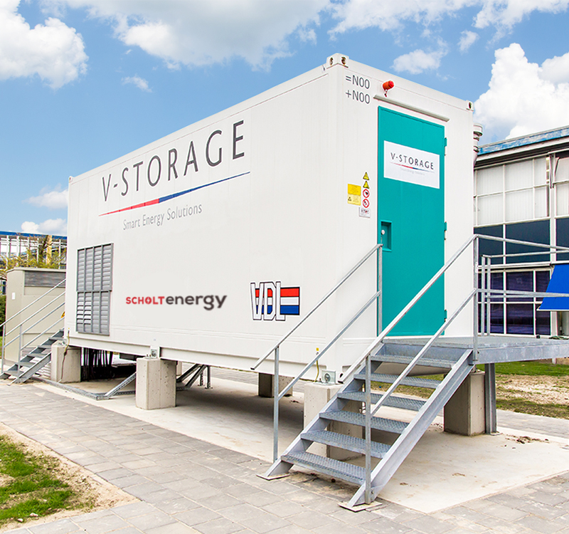 Zeven jaar geleden werd het gezamenlijke bedrijf V-Storage opgericht. Op 24 april 2017 werd het batterijsysteem van V-Storage in gebruik genomen op het terrein van VDL ETG in Eindhoven. Naast het laden en ontladen op gunstige momenten, wordt de batterij ook ingezet voor het in balans houden van het elektriciteitsnet. In 2017 was dit het eerste batterijsysteem in Nederland dat zogenoemde regel-energie leverde aan netbeheerder TenneT. Mede dankzij V-Storage heeft Scholt Energy in de afgelopen jaren veel kennis en ervaring op het gebied van energieopslag opgedaan en dit verder doorontwikkeld.